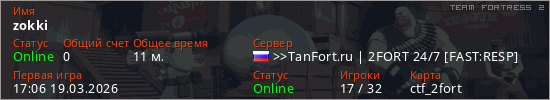Играет на Team Fortress 2 сервере. Страна: РоссияПервый раз замечен 17:06 19.03.2026