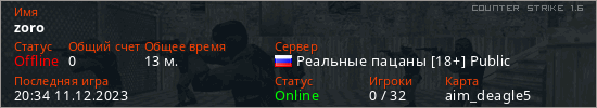 Играет на Counter Strike 1.6 сервере. Страна: РоссияПервый раз замечен 07:34 06.06.2023