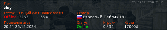 Играет на Counter Strike 1.6 сервере. Страна: РоссияПервый раз замечен 01:07 25.12.2019