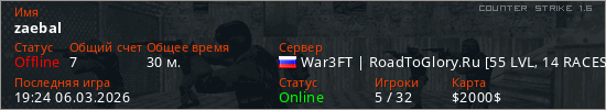 Играет на Counter Strike 1.6 сервере. Страна: РоссияПервый раз замечен 15:37 14.02.2026