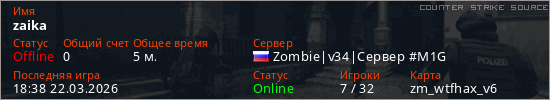 Играет на Counter Strike Source сервере. Страна: РоссияПервый раз замечен 18:36 22.03.2026