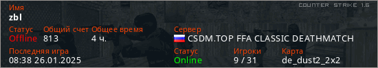 Играет на Counter Strike 1.6 сервере. Страна: РоссияПервый раз замечен 19:12 03.10.2023