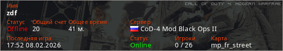 Играет на Call of Duty 4: Modern Warfare сервере. Страна: РоссияПервый раз замечен 17:15 08.02.2026