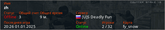 Играет на Counter Strike 1.6 сервере. Страна: РоссияПервый раз замечен 14:32 19.04.2024