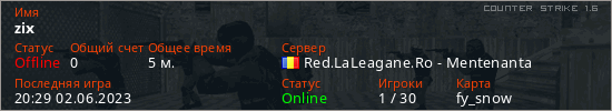 Играет на Counter Strike 1.6 сервере. Страна: РумынияПервый раз замечен 20:27 02.06.2023