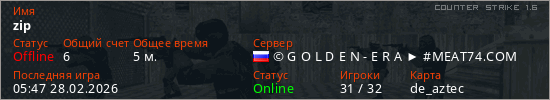 Играет на Counter Strike 1.6 сервере. Страна: РоссияПервый раз замечен 05:26 28.02.2026