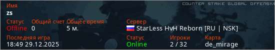 Играет на Counter Strike Global Offensive сервере. Страна: РоссияПервый раз замечен 18:47 29.12.2025