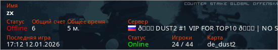 Играет на Counter Strike Global Offensive сервере. Страна: РоссияПервый раз замечен 16:44 12.01.2026