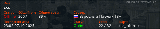 Играет на Counter Strike 1.6 сервере. Страна: РоссияПервый раз замечен 18:06 25.02.2020