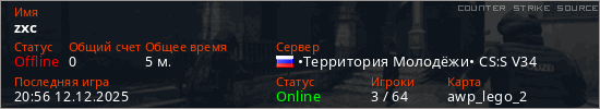 Играет на Counter Strike Source сервере. Страна: РоссияПервый раз замечен 20:43 12.12.2025