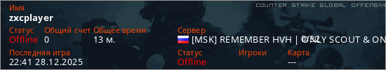 Играет на Counter Strike Global Offensive сервере. Страна: РоссияПервый раз замечен 18:42 28.12.2025