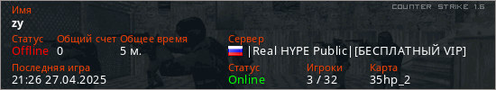 Играет на Counter Strike 1.6 сервере. Страна: РоссияПервый раз замечен 20:42 27.04.2025