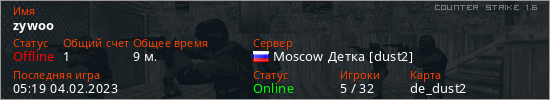 Играет на Counter Strike 1.6 сервере. Страна: РоссияПервый раз замечен 23:51 02.02.2023