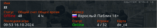 Играет на Counter Strike 1.6 сервере. Страна: РоссияПервый раз замечен 00:56 06.01.2020