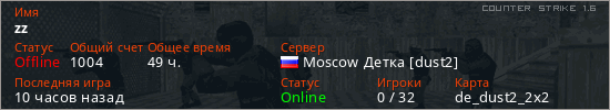 Играет на Counter Strike 1.6 сервере. Страна: РоссияПервый раз замечен 19:13 02.08.2020