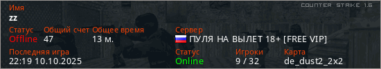 Играет на Counter Strike 1.6 сервере. Страна: РоссияПервый раз замечен 23:43 22.08.2025