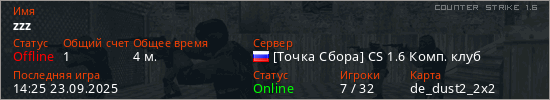 Играет на Counter Strike 1.6 сервере. Страна: РоссияПервый раз замечен 14:23 23.09.2025