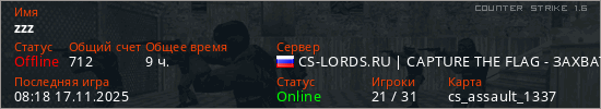 Играет на Counter Strike 1.6 сервере. Страна: РоссияПервый раз замечен 17:52 27.10.2021
