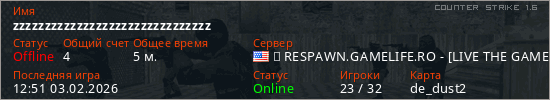 Играет на Counter Strike 1.6 сервере. Страна: СШАПервый раз замечен 12:26 03.02.2026