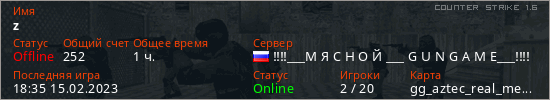Последний раз был в сети 18:35 15.02.2023 Игрок с таким ником замечен на 51 сервере
