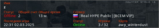 Играет на Counter Strike 1.6 сервере. Страна: РоссияПервый раз замечен 14:37 16.01.2025