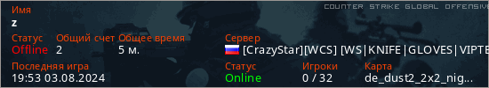 Играет на Counter Strike Global Offensive сервере. Страна: РоссияПервый раз замечен 19:51 03.08.2024
