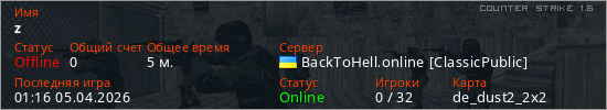 Играет на Counter Strike 1.6 сервере. Страна: УкраинаПервый раз замечен 01:10 05.04.2026