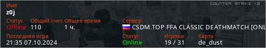 Играет на Counter Strike 1.6 сервере. Страна: РоссияПервый раз замечен 14:24 08.09.2024