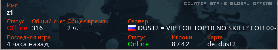 Играет на Counter Strike Global Offensive сервере. Страна: РоссияПервый раз замечен 20:14 22.07.2025