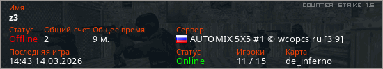 Играет на Counter Strike 1.6 сервере. Страна: РоссияПервый раз замечен 14:09 14.03.2026