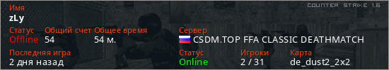 Играет на Counter Strike 1.6 сервере. Страна: РоссияПервый раз замечен 10:54 13.03.2026
