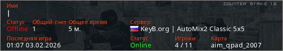 Играет на Counter Strike 1.6 сервере. Страна: РоссияПервый раз замечен 01:05 03.02.2026