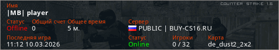 Играет на Counter Strike 1.6 сервере. Страна: РоссияПервый раз замечен 11:10 10.03.2026