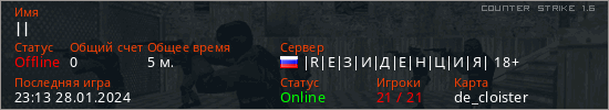 Играет на Counter Strike 1.6 сервере. Страна: РоссияПервый раз замечен 22:21 28.01.2024