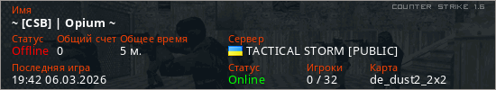 Играет на Counter Strike 1.6 сервере. Страна: УкраинаПервый раз замечен 19:34 06.03.2026