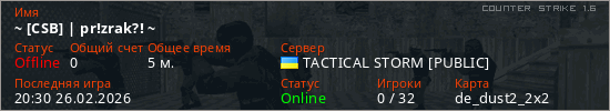 Играет на Counter Strike 1.6 сервере. Страна: УкраинаПервый раз замечен 20:21 26.02.2026