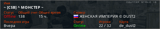 Последний раз был в сети Вчера Игрок с таким ником замечен на 23 серверах