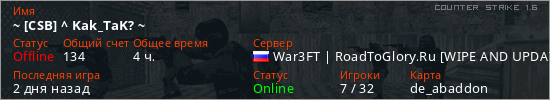 Играет на Counter Strike 1.6 сервере. Страна: РоссияПервый раз замечен 16:53 27.01.2022