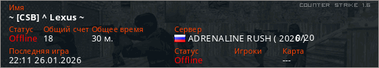 Играет на Counter Strike 1.6 сервере. Страна: РоссияПервый раз замечен 22:01 17.01.2026
