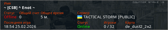 Играет на Counter Strike 1.6 сервере. Страна: УкраинаПервый раз замечен 18:52 25.02.2026
