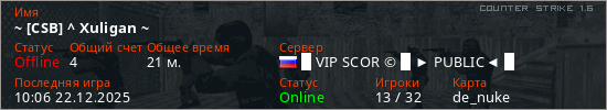 Играет на Counter Strike 1.6 сервере. Страна: РоссияПервый раз замечен 09:26 04.09.2025