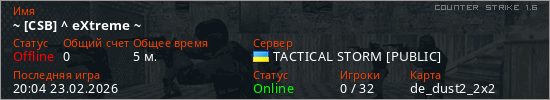 Играет на Counter Strike 1.6 сервере. Страна: УкраинаПервый раз замечен 19:49 23.02.2026