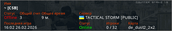 Играет на Counter Strike 1.6 сервере. Страна: УкраинаПервый раз замечен 14:53 26.02.2026