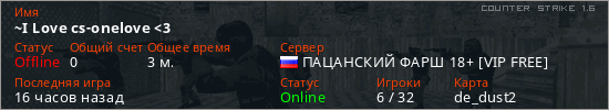 Играет на Counter Strike 1.6 сервере. Страна: РоссияПервый раз замечен 05:46 22.03.2026