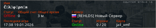 Играет на Counter Strike 1.6 сервере. Страна: РоссияПервый раз замечен 17:38 19.01.2026