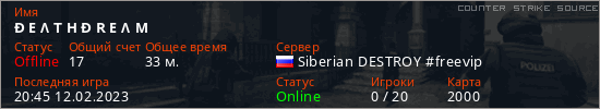 Играет на Counter Strike Source сервере. Страна: РоссияПервый раз замечен 20:15 12.02.2023