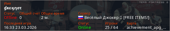 Играет на Team Fortress 2 сервере. Страна: РоссияПервый раз замечен 16:33 23.03.2026