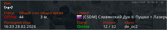 Играет на Counter Strike 1.6 сервере. Страна: РоссияПервый раз замечен 16:33 28.02.2026