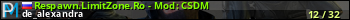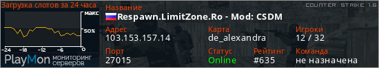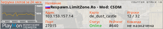 Respawn.LimitZone.Ro - Mod: CSDM представлен в виде сервера кс 1.6. Из всех имеющихся на сайте модификаций игровых серверов, наша система поставила метку DeathMatch сервера cs. В нашем мониторинге игровых серверов вы так же можете найти быструю навигацию по всем меткам - используйте главную страницу игры Counter Strike 1.6.