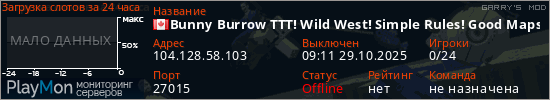 Общая информация ID: 66445 Ссылка: https://playmon.ru/server/104.128.58.103:27015 Адрес: 104.128.58.103:27015 Игроки: 0/24 Статус: Выключен Владелец: Не определён